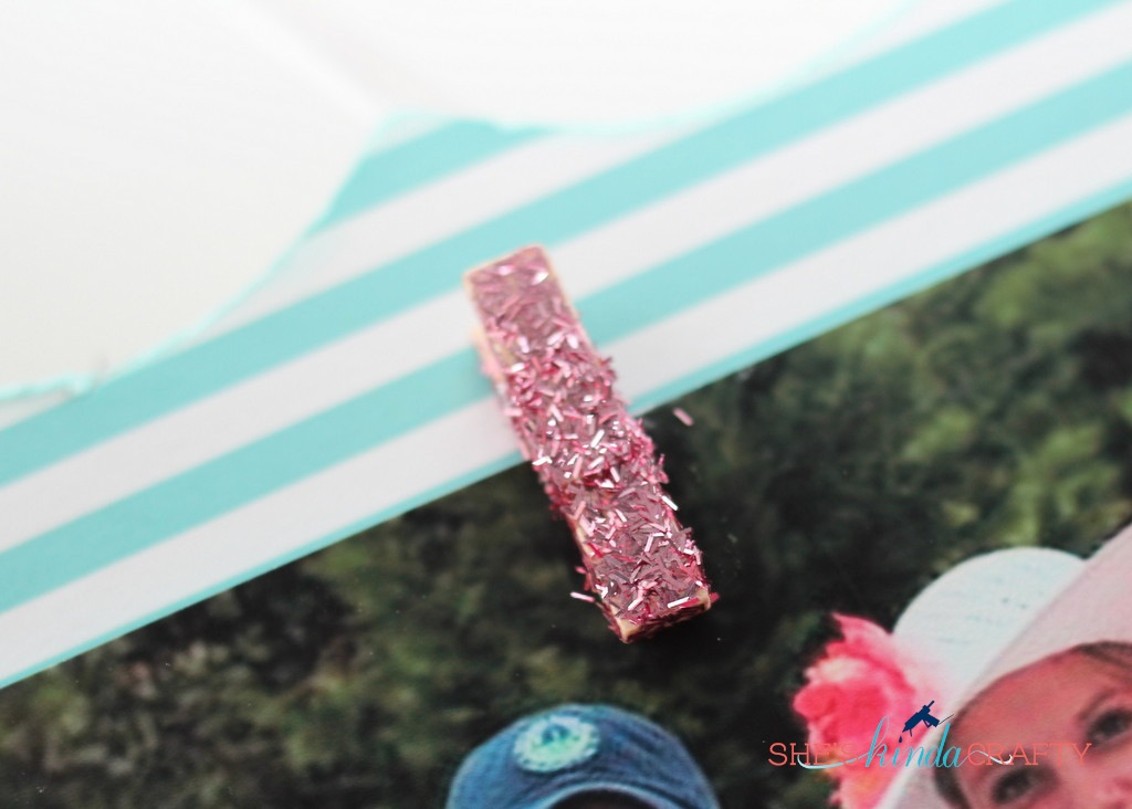 Use a little of your Mod Podge to apply a thin layer to your mini clothespin and then shake liberally with glitter. I only had tinsel glitter in the color I wanted but I think regular glitter would be better since the clothespin is so small. Give it a minute or so to dry (let it dry while you go trim the excess paper from around your chipboard) and then use a small dab of hot glue to secure the clothespin into place.